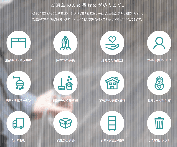 遺品整理 生前整理 空き家片付け 部屋片づけ ゴミ屋敷片付け 特殊清掃(孤独死現場も可) 遺品・不用品の買取 仏壇や遺品の供養 ハウスクリーニング(オプション)※最後の簡易清掃は無料 写真整理(オプション)
