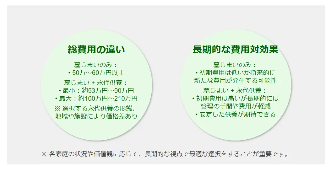 墓じまいと永代供養は、お墓の管理や故人の供養に関する重要な選択肢です。両者の費用を比較することで、長期的な視点での経済的影響を理解し、適切な判断を下すことができます。このセクションでは、墓じまいだけの場合と永代供養を含む場合の総費用の違い、そして長期的な視点での費用対効果について詳しく解説します。