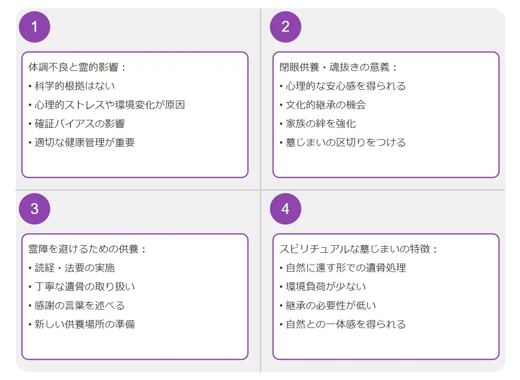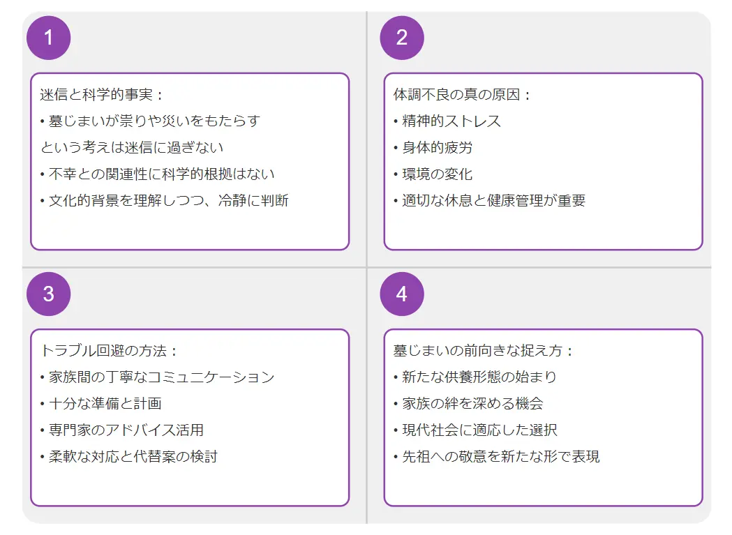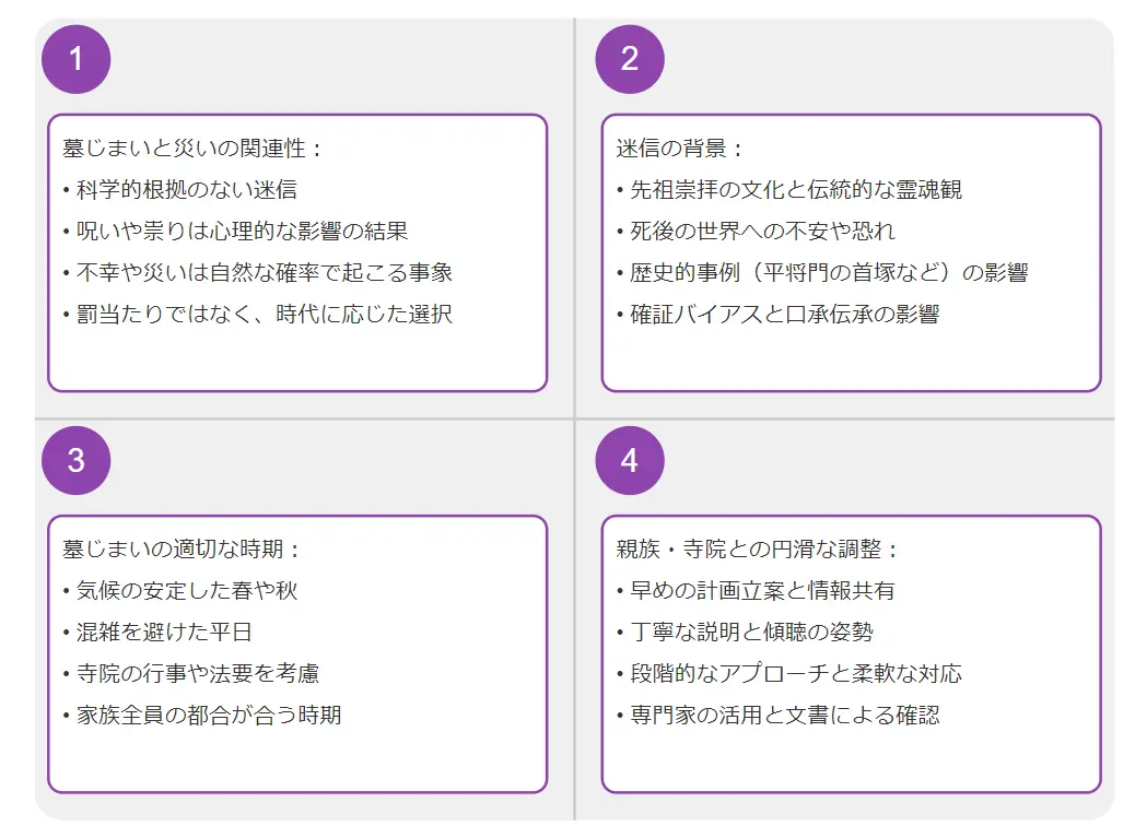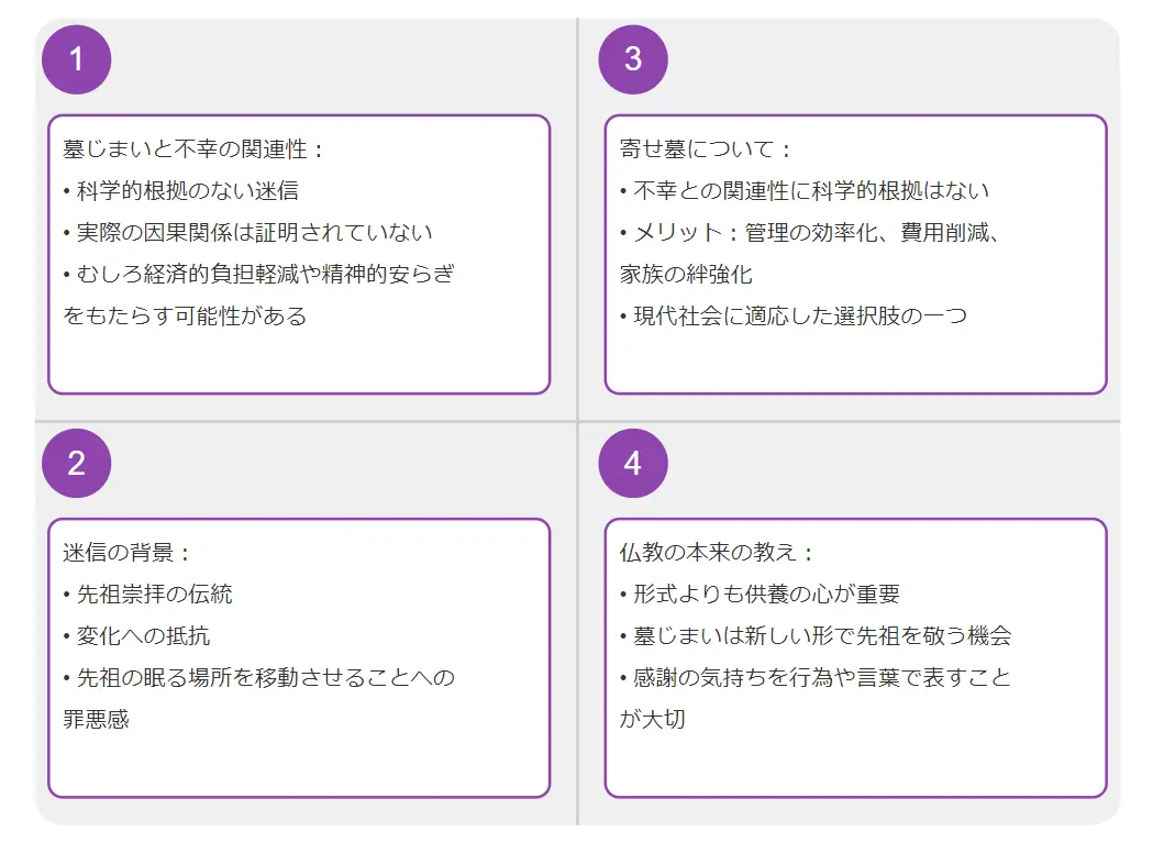 – 墓じまいが祟りや災いをもたらすという考えは、迷信に過ぎません。