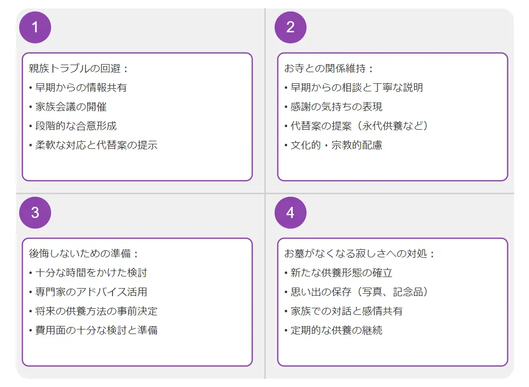 – 墓じまいに反対する親族には、別の供養方法(例:永代供養)を提案します。