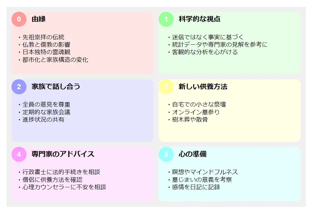 墓じまいと不幸の関連性に科学的根拠がないことを理解します。統計データや専門家の見解を参考に、迷信ではなく事実に基づいて判断することが重要です。例えば、墓じまい後の家族の健康状態や経済状況を客観的に分析することで、不幸との因果関係がないことが確認できるでしょう。