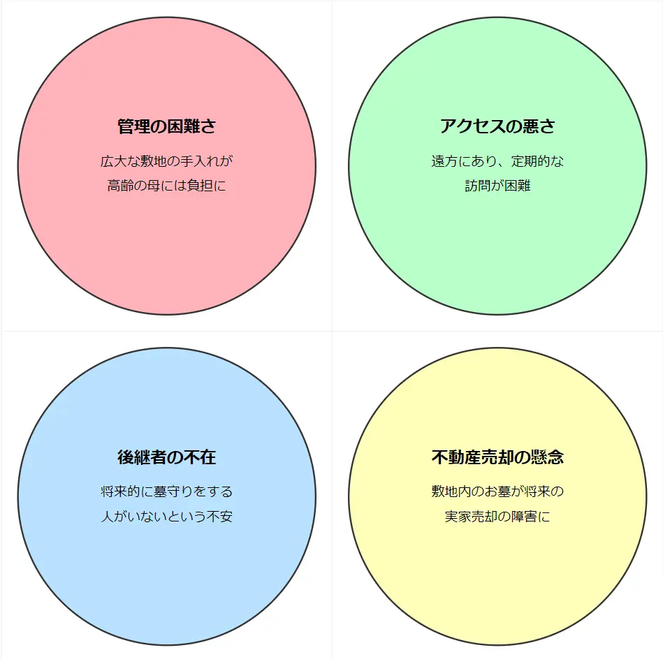 – 後継者の不在:将来的に墓守りをする人がいないという不安がありました