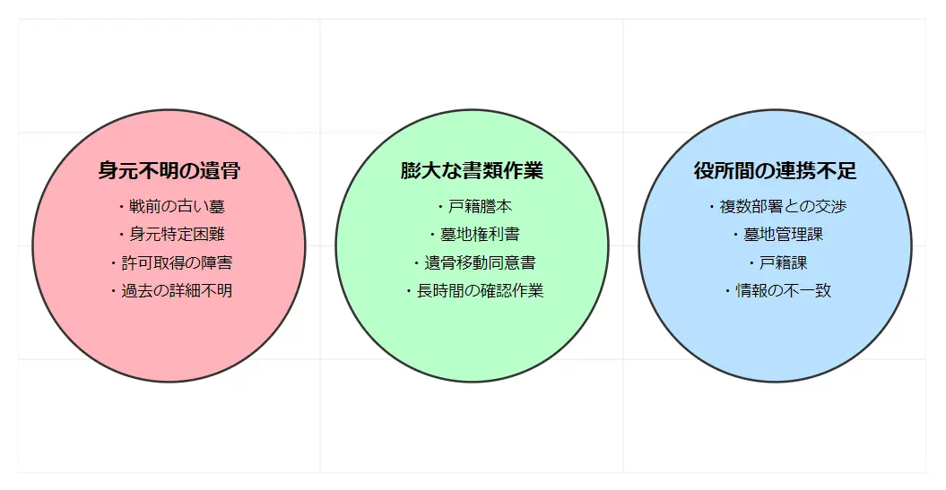 ②身元不明の遺骨の存在:身元が特定できない遺骨が含まれており、役所の許可を得るのが困難