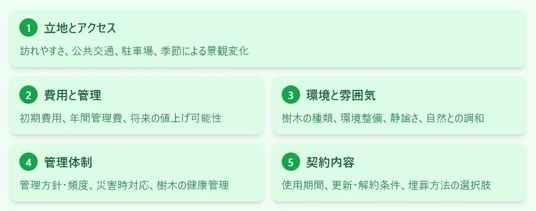 樹木葬を選ぶ際には、いくつかの重要なポイントと注意すべき点があります。ここでは、後悔のない選択をするための秘訣を詳しく解説していきます。