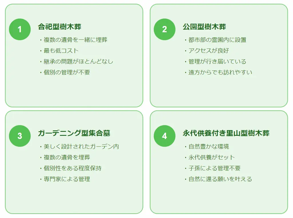 そこでこの記事では、樹木葬の主な種類とその特徴、選び方のポイントについて詳しく解説します。里山型、公園型、ガーデニング型といった場所による分類から、個別型、集合型、合祀型といった埋葬方法による分類まで、それぞれの特徴やメリット・デメリットを分かりやすく説明します。