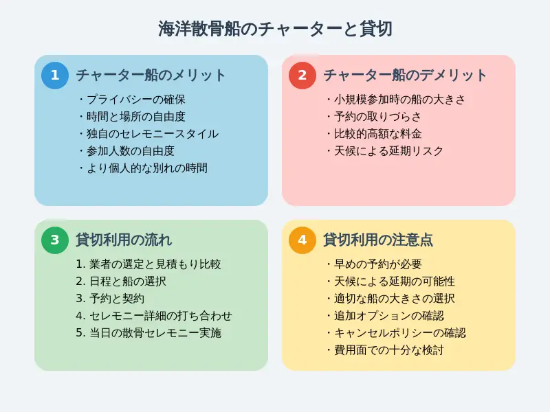 海洋散骨を行う際、船をチャーターしたり貸し切ったりすることで、より個人的で意味深い セレモニーを行うことができます。このセクションでは、チャーター船のメリットとデメリット、そして貸切利用の流れと注意点について詳しく解説します。