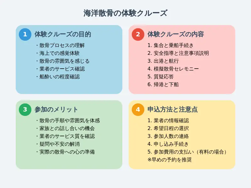 海洋散骨を検討している方にとって、体験クルーズは貴重な機会となります。このセクションでは、体験クルーズの目的と内容、そして参加のメリットと申込方法について詳しく解説します。