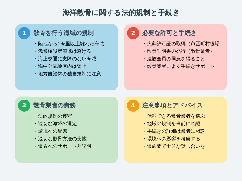 海洋散骨を行う際には、法的規制や必要な手続きを理解しておくことが重要です。このセクションでは、散骨を行う海域に関する規制、必要な許可と手続きの流れについて詳しく解説します。
