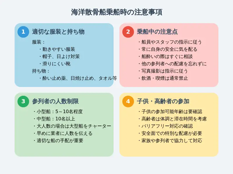 散骨船の大きさや安全性の観点から、参列者の人数には制限があります。また、子供や高齢者の参加については特別な配慮が必要です。