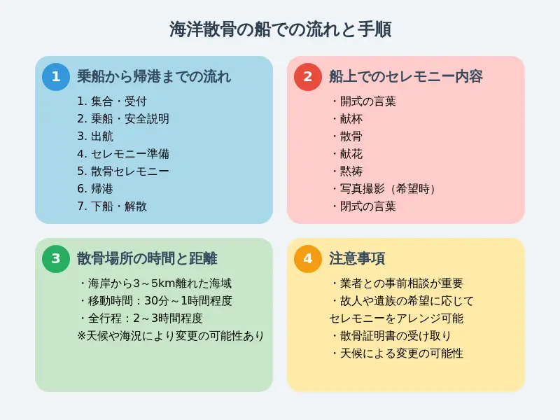 海洋散骨を行う際の具体的な流れと手順を理解することは、スムーズで心のこもったセレモニーを実現するために重要です。このセクションでは、乗船から帰港までの一連の流れ、船上でのセレモニーの内容、そして散骨場所までの所要時間と航行距離について詳しく説明します。