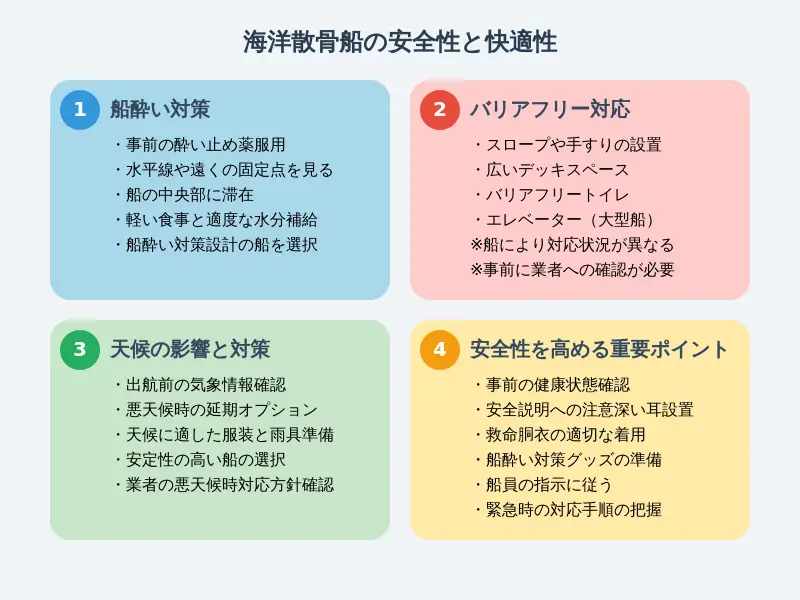 - バリアフリー対応が必要な場合は、予約時に業者に相談し、適切な船を選びます。