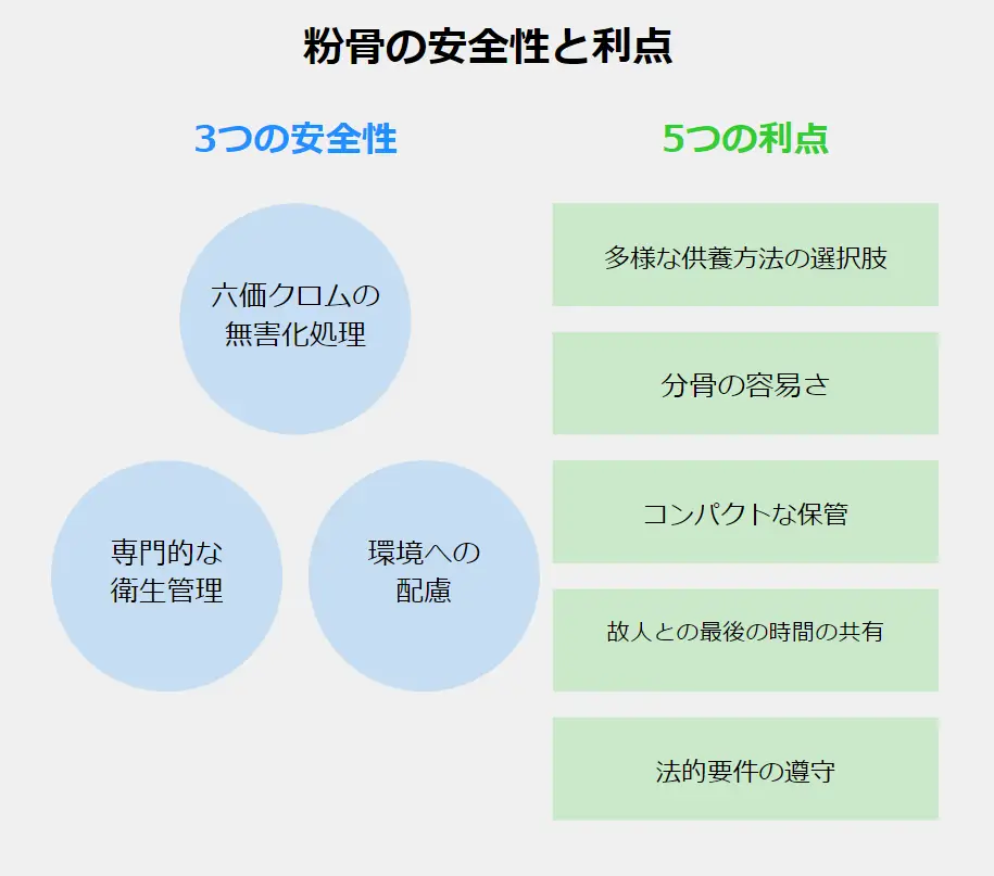 粉骨は、安全性の向上と環境への配慮を両立させる重要な処理です。専門業者による適切な粉骨を行うことで、故人の尊厳を守りつつ、遺族の安全と環境保護にも貢献できます。